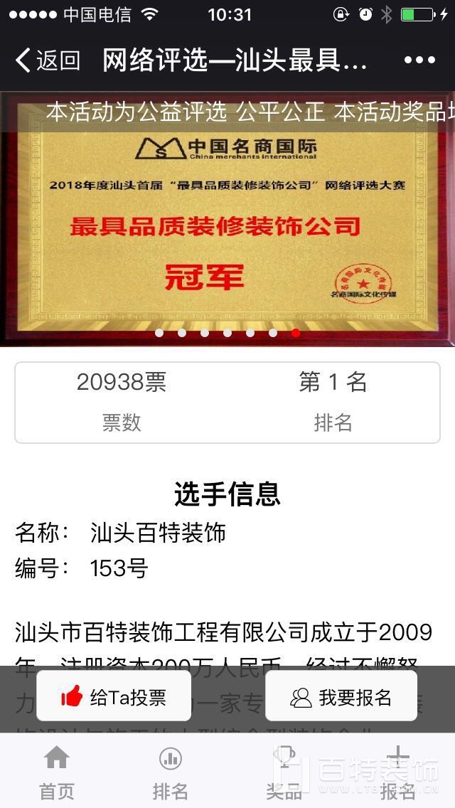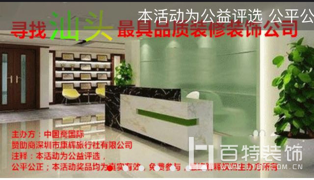 2018年度首屆“汕頭最具品質裝修裝飾公司”網評大賽在5月6號拉開序幕,以公平每人一票為標準,我司有幸參賽,在眾多朋友們的支持下,投票數(shù)直線上升,一路搖搖領先,喜獲2018年度“汕頭最具品質裝修裝飾公司"【冠軍】殊榮,感謝支持百特裝飾的眾多人士們,百特人定不忘初心、再接再厲,作為行業(yè)品質的典范,充分發(fā)揮言必行、行必果。
