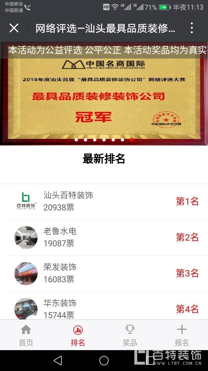 熱烈慶祝我司榮獲”汕頭最具品質裝修公司“網評大賽第一名【冠軍】